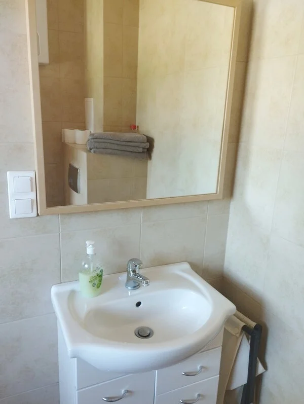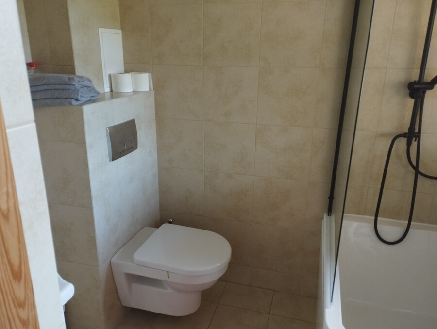 The apartment consists of an atmospheric living room with a fireplace (along with wood and kindling), from which guests have direct access to the furnished terrace. A fully equipped kitchenette, with a separate 2-bed bedroom, a bathroom with a bathtub with a built-in shower and a hall with a large, spacious wardrobe.